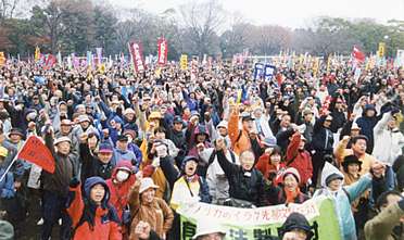 陸・海・空・港湾労組20団体と宗教団体が呼びかけたSTOP!有事法制12・1大集会は、雨と寒風の中に5〜6月以来の2万5千人が結集し闘い抜かれた。