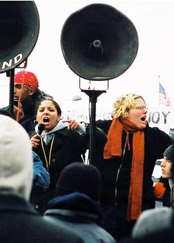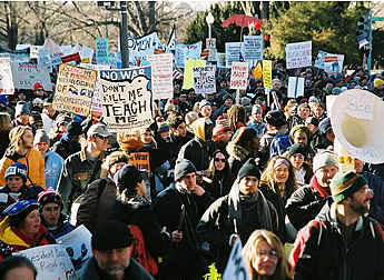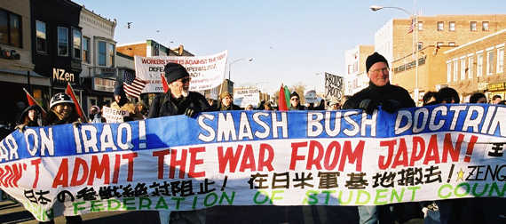 私は、1月19日に福岡市内で行われたイラク反戦の米領事館デモに参加しました。さまざまな団体・個人が「イラク攻撃反対!」の一点で共同し、なおかつ国際連帯で取り組んだこのデモは、今後の闘いの展望を切り開いたと感じました。