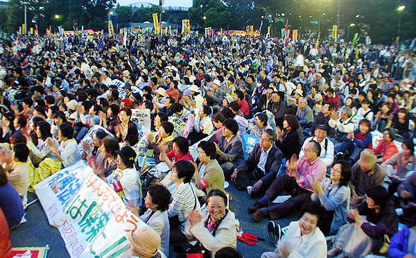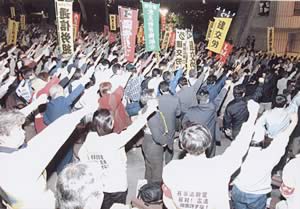 5月23日夕、「STOP!有事法制 大集会」が開催された東京・明治公園は3万人を超える労働者・学生・市民で埋め尽くされた。有事3法案に賛成した民主党の大裏切りが徹底弾劾され、「戦争の加害者にも被害者にもならない」、有事法制を廃案にするまで闘うと力強く宣言された。国会を人民の怒りで揺さぶり、戦争翼賛をうち砕く闘いはこれからだ。日帝・小泉の北朝鮮に対する排外主義扇動を弾劾し粉砕せよ。全国各地で有事立法と労働法制大改悪を許さない闘いを巻き起こせ。国会闘争を果敢に闘い、6月上旬参院決戦に猛然と攻め上ろう。