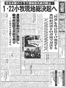 1月23日に、天皇が来沖しようとしている。「国立劇場おきなわ」完成記念の「こけら落とし公演」を参観するという。1995年の9・4事件を契機とする沖縄の「新たな人民反乱」に恐れをなし、以来沖縄に足を踏み入れることを避けてきた天皇が、自衛隊イラク派兵の重大情勢のもと、またぞろ沖縄にやってこようとすることに対し、心の底からの怒りをもって弾劾する。(1面に闘争要項)