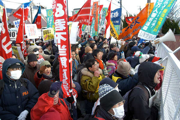 約500人が小牧基地ゲート前を制圧し、空自隊員に声を限りに叫び続けた(1月22日 午後4時) |