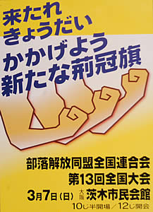 3月7〜8日、大阪で部落解放同盟全国連合会第13回全国大会が開催される。寝屋川弾圧の完全無罪と、5万人組織建設に向け、ともに闘おう。(写真は大会ポスター) |