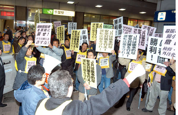 JR千葉支社管内では、1月に総武快速線と津田沼電車区でレールが折れたのに続き、3月5日には総武快速線の新小岩〜錦糸町間で、枕木がずれてレールの間隔が14_も縮小していた。動労千葉はぎりぎりまで交渉を続けたが、千葉支社が抜本的な安全対策について回答しないため、断固ストを決行したのだ。