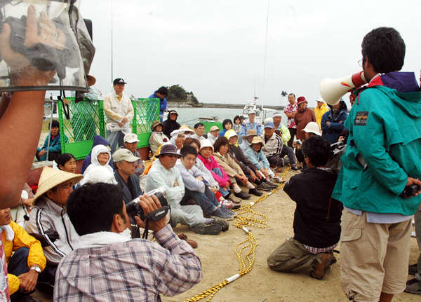 事実上の名護新基地建設着工である 「ボーリング調査」は4月19日以来連休明けまで阻まれている(4月26日午前 辺野古漁港=記事4面