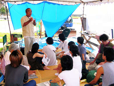 名護新基地建設阻止の座り込み闘争「2639日+90日」、駆けつけた高校生に話をするヘリ基地反対協の安次富浩共同代表(7月17日 辺野古)