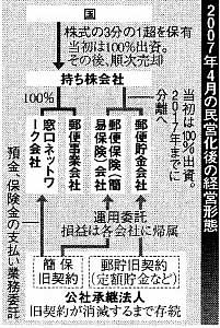07年4月の民営化当初の経営形態については、麻生総務相や郵政公社の生田総裁らが主張していた「単一会社でスタート」という案を小泉は退け、当初から「純粋持ち株会社のもとに、窓口ネットワーク会社、郵便事業会社、郵便貯金会社、郵便保険(簡易保険)会社に分社化する」という方針を強行決定した。