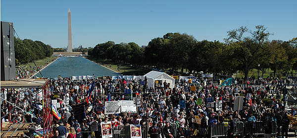 17日午前11時過ぎ、ホワイトハウス直近のリンカーン記念館前には、広大な全米各地から飛行機やバスや車に乗って何時間もかけて1万5千人の労働者人民が続々と結集した。雲一つない秋晴れにめぐまれた会場には、朝早くから組合の横断幕(バナー)や色とりどりのプラカードを持った労働者が次々に集まった。