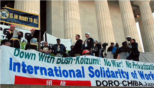 10月17日、アメリカの首都ワシントンDCで米労働者階級人民は、医療、社会保障、最低賃金保障など22項目の要求とイラク戦争反対などを掲げてMWM(ミリオン・ワーカー・マーチ)に決起した。ILWU(国際港湾倉庫労働組合)ローカル10などが呼びかけたMWMには、350万人を組織する全米各地の労働組合が賛同した。国家権力とAFL−CIO(米労働総同盟・産別会議)の妨害を蹴破って結集した1万5千人は350万人の代表だ。動労千葉は国外の賛同団体として招待され、支援を含む26人の派遣団を代表して佐藤正和新小岩支部長が発言し、ともに闘った。(本紙 城崎健夫)=関連記事2、3面