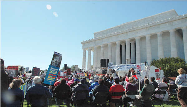 全米各地から権力やAFL−CIOの制動を蹴破り、多くの労働者がMWMに参加。プラカードを掲げ首都ワシントンDCのリンカーン記念館前を埋めた(10月17日)