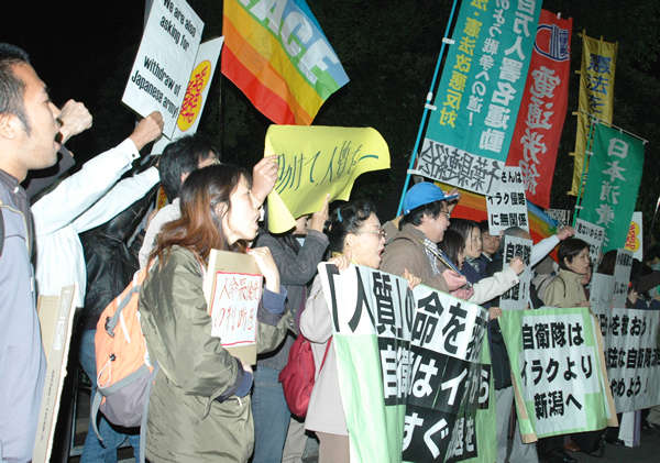 連日200〜300人の労働者人民が小泉発言に怒り、「香田さんを見殺しにするな」「自衛隊を今すぐ撤退させろ」と、首相官邸前に詰めかけた(10月28日)