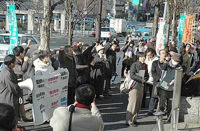 昨春卒・入学式で不起立闘争などを闘った教育労働者が、7月「再発防止研修」時のゼッケン着用などを口実に、再度の処分と「再発防止研修」を受けた。被処分者は転向強要を敢然とうち破り、都教委を追及して意気高く闘った(1月19日 水道橋)=詳報次号