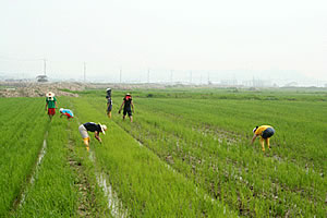 〔写真上右〕遅れている農作業に精を出す援農の学生たち(6月28日 ピョンテク)