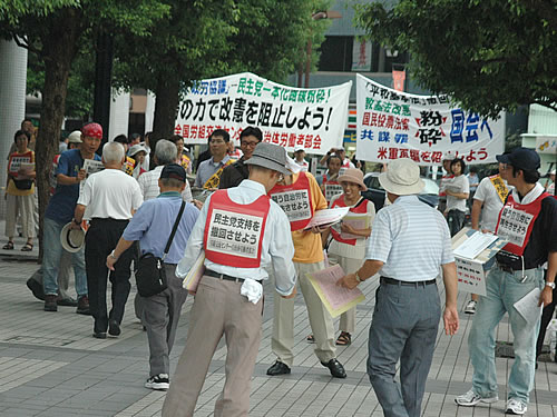 「3人の息子たちは戦争をするために自衛隊にはいったんじゃない! 戦争のための憲法は反対だ!」「小泉を辞めさせて!」と、隊員の母が駆け寄ってきて叫んだ。街頭で隊員やその家族にもアピールしていた矢先の事だった。「9条を変えるな!」こそ隊員や家族の声だ。隊員家族と元自衛官連絡会の会報を読もう。ホームページを見よう。この新たな対自衛隊闘争を支え守ろう。