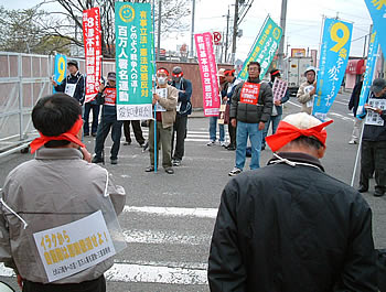 11月26日、東海3県の「とめよう戦争への道!百万人署名運動」主催の小牧基地申し入れ行動を行いました。地元を中心に東京、関西からも代表が参加し、総勢35人が「イラクから航空自衛隊は撤退せよ」「小牧基地への空中給油機の配備を許すな」の訴えを全力で行いました。(写真)