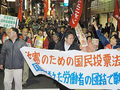 4月27日夜、青年労働者と学生を先頭に、反戦共同行動委員会による改憲投票法案阻止の集会とデモが都内で闘われた。