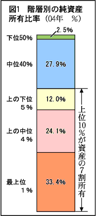 他方、資本家階級はますます裕福になっている。まず所得で見ると、上位2割の層が所得全体に占める割合は50・4%に及ぶ(05年)。さらに純資産では、上位1%の世帯で3割強、上位10%の世帯で約7割を占める(図1)。全体の6割の世帯は金融資産がなく借金があるだけだ。