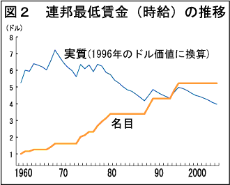 実質賃金は73年をピークとして今にいたるまで低下しつづけ、過去50年間で最低水準になっている(図2。連邦最低賃金は60年代末がピーク)。貧困レベルの賃金(平均時給7j)以下の労働者が約2800万人、全労働者の23・3%を占める(03年統計)。また、最低の生活ができる「生活賃金」は時給にすると14j(約1600円)と試算されるが、全労働者の60%もが時給14j以下という統計もある(参考文献C)。