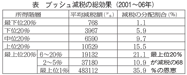 特にブッシュ政権は、相続税の軽減、株式の配当や値上がり益(キャピタルゲイン)への減税など、資本家階級への減税を繰り返している。01年・02年に決められたこの二つの減税だけで、円換算でなんと34兆円! ブッシュ政権による減税を総計すると、01年から10年までの平均の減税額は、所得下位20%では768j(9・2万円)なのに対し、最上位1%では50万j(6000万円)近くに達する見込みだ(表 参考文献D)。