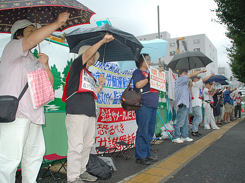 しの突く雨の中、出勤時に国会前の地下鉄駅の出入口でビラをまき、その後、議員会館前の歩道に陣取ってアピールした。