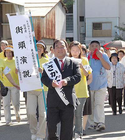 出陣式を終え、猛暑の中を「さかぐちコール」を響かせて地元荒本を練り歩く、さかぐち候補と支持者たち(9月16日)