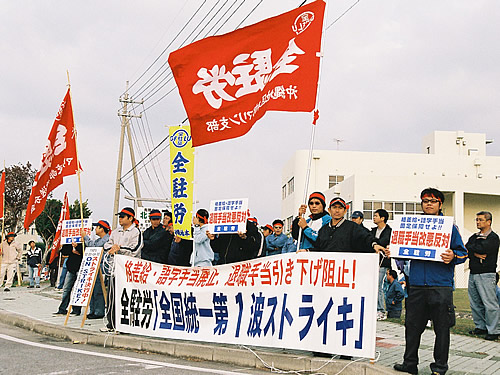 全駐労沖縄地区本部は19日の総決起集会を成功させ、21日には米軍基地40あまりのゲートに3支部(マリン・ズケラン・空軍)でピケ。マリン支部は、キャンプ・シュワブ、キャンプ・ハンセンなどの海兵隊施設でピケを張ってストを貫徹。