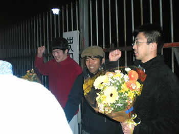 ただちに、仲間たちは、東京拘置所の門前へ飛び、2人を出迎えた。寒風の吹きすさぶ中、2時間待ってようやく2人の姿が見えた!