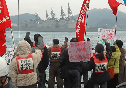 1月24日、神奈川労組交流センターと反戦共同行動委員会、とめよう戦争への道!百万人署名運動、婦人民主クラブ全国協議会の労働者・市民は、海上自衛隊横須賀基地からの護衛艦「むらさめ」のインド洋派兵を徹底的に弾劾した。