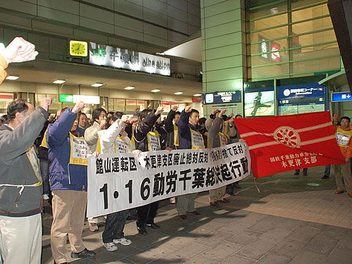 1月15日津田沼、16日船橋と、初雪が舞う冷え込みの中、ちば合同労組の熱い呼びかけが響き渡った。反応はすごくいい。ビラを受け取る人が格段に増えたと実感できる。とりわけ若い労働者は受け取る手に力がこもっているのがよくわかる。一杯入った年輩の男性がベンチでじっと耳を傾けてやおら立ち上がり「正しいことを言っている」と握手を求めてくる。あちこちで、組合員に話しかけ、話し込む光景が出現した。