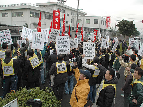 その後、一部業務の外注化が強行された京葉車両センター(千葉市、習志野市)門前に全支部から100人の組合員が集まり、怒りの声をたたきつけた。JR千葉支社は2月から、千葉管内で初めて京葉車両センターでの車輪転削業務外注化を強行した。車輪の転削業務は危険と隣り合わせである上、車両を安全に運行するためにきわめて精密な作業が問われる仕事だ。動労千葉は、こうした業務を徹底した低賃金で外注化したJR東日本の安全無視の姿勢を徹底弾劾した。