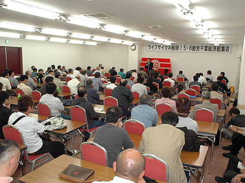 動労千葉は5月8日、「ライフサイクル粉砕!」を掲げて総決起集会を開催した。会場の千葉市民会館には、組合員と支援あわせて200人が集まった。動労千葉は、ライフサイクル制度そのものの粉砕、異動の対象となっている津田沼支部・滝厚弘君の駅への強制配転を絶対阻止するために、全本線運転士のストライキを配置し、決戦段階の闘いに全面的に入った。「一人の仲間のために、全組合員がストライキで立ち上がる」――これが動労千葉だ。