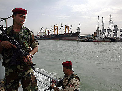 【右】 武装し港湾をパトロールするイラク政府軍。この重圧下でイラク港湾労組はストに決起
