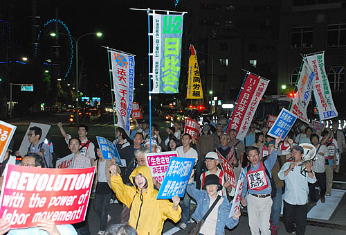 東京では27日夜、650人の労働者・学生が文京区民センターでの集会の後、神田・錦華公園までデモした。