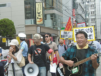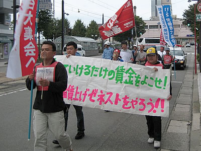 名古屋ではトヨタ(名古屋駅前ビル)への怒りのデモ。トヨタを解雇され東海合同労組に加入した青年は「トヨタは派遣労働者への差別でいっぱい。汚い会社だ。トヨタはおれたち働く人間をゴミ扱いするな!」と怒りの発言。「労働者の血と汗を返せ」「下請けいじめをやめろ」のデモコールに沿道から大注目。「がんばれ」の声援も。