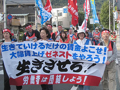 集会後のデモで賃上げゼネストを呼びかけ。沿道からも合流した=記事へ
