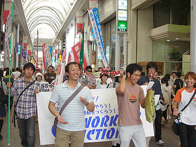 【写真右】 福岡 “街頭の労働者との合流”をテーマに多数のビラまき隊配置しデモ