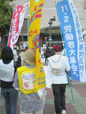 住宅明け渡し攻撃と闘う部落解放同盟全国連西郡支部、民営化絶対反対に立ち上がった八尾北医療センター労働組合、法大決戦を闘う全学連が特別アピール。国鉄労働者、自治体労働者、教育労働者、医療労働者、ス労自主などから発言が続いた。「橋下は“ダメ教師”などとわれわれを罵倒(ばとう)している。現場に怒りが満ちている」と教育労働者。民間労働者は「橋下は『民間では当たり前』と言うが、民間で橋下のような社長がいたらたたき出す!」。「橋下打倒」「1047名解雇撤回」を訴えデモを闘った。