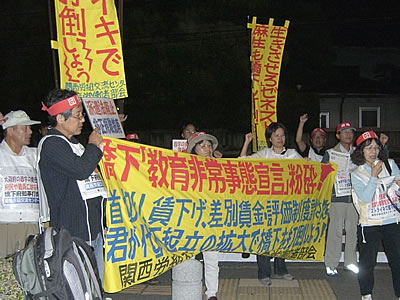 (写真右 大阪府庁前で教育労働者が国際連帯行動。20人余りが次々とマイクを握り橋下知事を弾劾した)