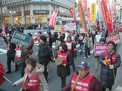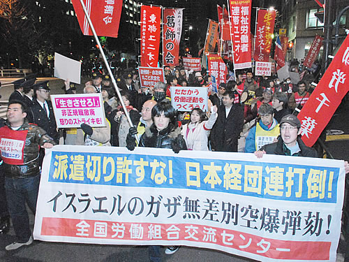 「派遣切り許すな! 1・8日本経団連打倒デモへ!」「イスラエルのガザ空爆弾劾!」を掲げた労組交流センター主催のデモが1月3日、渋谷の街を席巻した。この間の街宣で出会った「派遣切り」解雇の労働者も決起した。次々と青年労働者がアピール。全学連の織田陽介委員長も「イスラエル空爆反対デモが世界中で行われている。戦争、大恐慌と対決してデモする時だ」と訴えた。