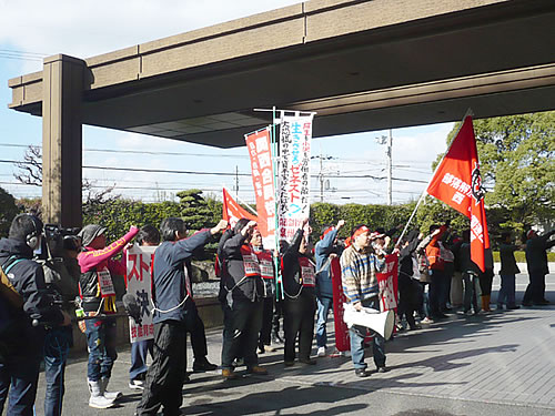「このデモは労働者の力で資本主義を終わらせるデモだ。森精機のストに続いて『生きさせろ!』ゼネストをやろう」「派遣も正社員も公務員労働者も一つだ」――デモ出発前に気勢を上げた。