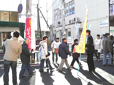 「解雇、派遣切り、雇い止め、人の首を切るっていうことがまかりとおっている今の社会は許せない。わたしたちは一人の首切りも許さない原則をとことん貫く闘う労働組合です」と街頭でガンガン訴えました。