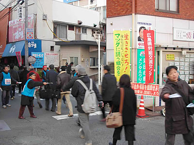 広島県労組交流センターは、マツダの労働者に対し、連日早朝宣伝活動を行っている。12月18日には、マツダ本社工場の最寄り駅・向洋(むかいなだ)駅前に8人で登場し、マイク宣伝とビラまきを行った。「生きさせろ! 俺たちはモノじゃない! マツダに闘う組合を」と書かれた黄色ののぼりと県労組交流センターの赤いのぼりを掲げ、「一人の首切りも許すな! 闘う労働組合をよみがえらせ、団結して闘おう!」と訴えた。