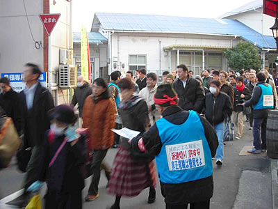「1600人もの派遣切りに何も闘わないマツダ労組執行部は正社員も絶対に守らない。組合を現場労働者の手に取り戻し、首切り絶対反対・解雇撤回・大幅賃上げを掲げてストライキで闘おう」というアジテーションに対し、反動組合幹部連中は何も言えず、顔を引きつらせるのみ。駅構内のタクシー労働者も「客に渡すよ」とビラを何枚も受け取り、宣伝隊の訴えに「そうだ!」と大声で声援を送った。
