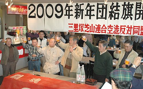 中野洋常任顧問の音頭で乾杯。参加者が次々とマイクをとって新年のあいさつと決戦の09年に向けた決意を表明した。萩原さんは「動労千葉が平成採の青年を獲得しているように、反対同盟は全国の農民を獲得する闘いにうって出る。平成採を獲得して労働者の主流になろうとしている動労千葉をかがみとし、われわれも農民として闘い抜く。そして大合流し勝利をつかみとる」と述べた。動労水戸の石井真一委員長は、運転士登用差別裁判における完全勝利を報告するとともに「平成採を始めとする全国の運転士を動労総連合に獲得する闘いへ」と決意と展望を語った。杯を酌み交わしながらの歓談、恒例のビンゴゲームで大いに盛り上がった。