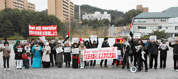 広島大学では、広大生と留学生に生協職員も加わった総勢50人が、キャンパス中央の通称「スペイン広場」で昼休みに集会を行った。「ガザで殺されている労働者も、内定を取り消された学生も、派遣切りされた労働者もみんな同じ存在だ。アメリカが中東を軍事力で支配するのも、企業がリストラするのも、すべて世界金融大恐慌から来ている。資本主義はもう終わりだ。これに対して世界では資本主義社会をのりこえる労働者階級の団結がガンガン形成されている。俺たちは団結できるんだ! 団結したら絶対この社会は変わる。今日は世界の闘いと連帯するデモだ!」