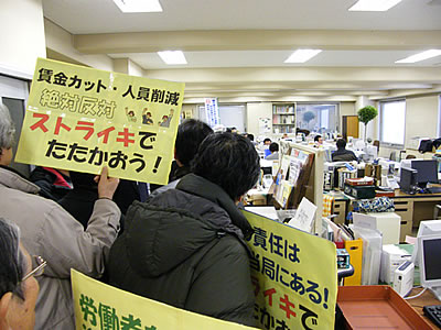 市長の閉鎖発表の引き金になったのは07年12月の総務省「公立病院改革ガイドライン」だ。すべての自治体に年度内に公立病院経営改革計画を作ること、赤字病院は3年以内に結果を出すこと、結果の出ない病院はつぶしてしまえと激しく迫っている。市長と与党自民・公明は「建て替えに100億円もかかるから再建は無理」と突然閉鎖を発表し、12月議会で廃止条例を通過させたのだ。道州制を進める橋下府知事は「どこかで決断しないと自治体の財政は逼迫(ひっぱく)してしまう」と市長のクーデターを支持した。絶対許せない! 病院労働者は院長から「明日閉鎖発表」と聞いた27日、80人が市役所に押し寄せ、市長追及・弾劾に立ち上がった。病院存続を求める署名は2カ月で3万5千も集まっている。