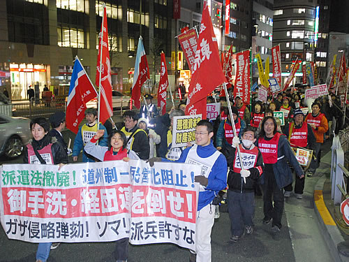 「生きさせろ!」ゼネストの爆発へ向け、全国で進撃が始まっている。経団連第3波デモには「派遣切り」にあった労働者を先頭に380人が結集、御手洗への怒りを爆発させた。法大入試闘争は当局・権力一体の妨害を打ち返し、受験生との圧倒的合流をかちとっている。青年労働者と学生はストレートに行動を求め、革命と革命党を求めている。体制内勢力をぶっ飛ばし、「生きさせろ!」ゼネストへ。マル青労同・マル学同の各1000人組織建設を闘いとろう。2・16集会を大成功させ、道州制粉砕・橋下打倒の3・6大阪府庁前闘争に全国から総決起し、3・20ワーカーズアクション全国総結集闘争へ進撃しよう。麻生によるソマリア沖海自派兵の3月強行に対し、広島県呉現地闘争に全国から決起しよう。