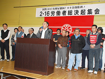 2・16労働者総決起集会では、4者4団体との非和解的対決を激烈に闘う国鉄労働者、教労・自治体・全逓の仲間、各地で続々とストに立ち上がっている労組の代表が次々と登壇して闘いの報告と決意を表明した。1047名闘争と道州制反対闘争、「生きさせろ!」の怒りがひとつにつながり、新たな1047名闘争の開始を宣言する画期的集会となった。田中委員長の基調報告(要旨)と、争議団・闘争団、被告団の発言を紹介します。(編集局)
