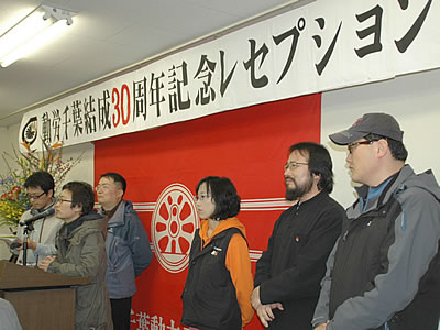 第1部では、多くの来賓を代表して三里塚反対同盟の北原鉱治事務局長、韓米の代表が万感の思いをこめてお祝いの言葉を贈った(韓米代表の発言要旨2面)。北原さんは、「動労千葉とともに闘ってきた年月を振り返ると感無量だ。平坦な道のりじゃなかったが、動労千葉30年の闘いこそが全国の労働者の希望の星だ」と述べ、3・29三里塚集会への参加を呼びかけた。