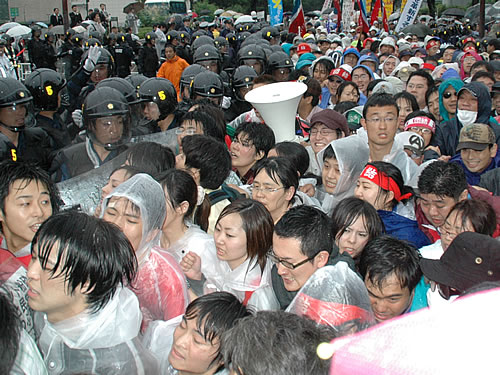 内海君は彼自身も逮捕された06年3・14弾圧を「けっして忘れることはできない」と徹底弾劾した。その後、法大当局が強行した退学処分など「絶対認めないし従わない」との決意は、キャンパスの学生の怒りと結合した。5月19日、処分発動の当日には、内海君をたたき出そうとする法大当局を、逆に数百人の学生が包囲して実力で阻止した。