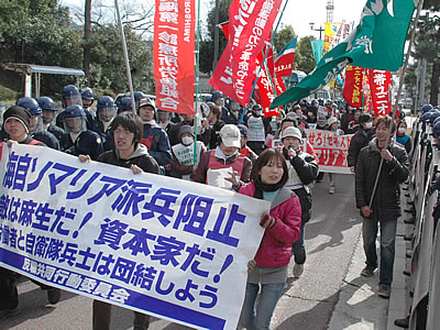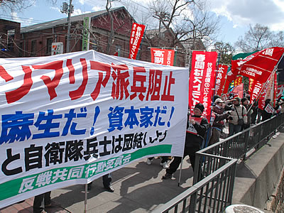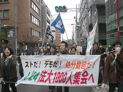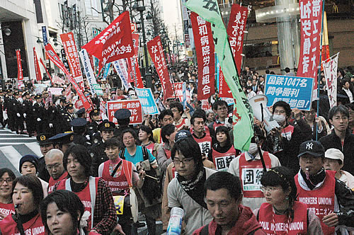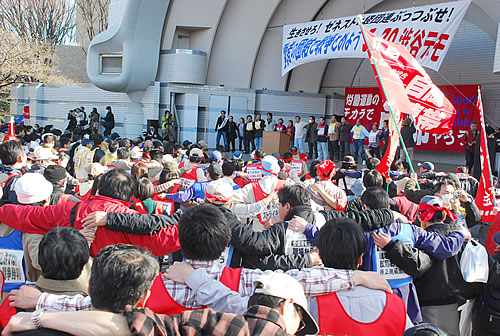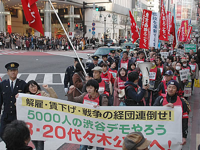 「労働者のストライキと国際的団結で戦争とめよう」のメインスローガンのもとに、ワーカーズアクション実行委主催のイラク反戦6周年3・20集会と渋谷デモがかちとられた。青年労働者・学生を先頭に1850人が結集し、大恐慌と戦争の帝国主義の危機に対して、プロレタリア世界革命をめざして闘う階級的労働運動の力強いメッセージを全世界に発信した。3・20デモの大成功に続き、3・29三里塚現地闘争に総決起しよう。09春闘から第2次国鉄決戦勝利、道州制・民営化粉砕の一大闘争へ進撃しよう。